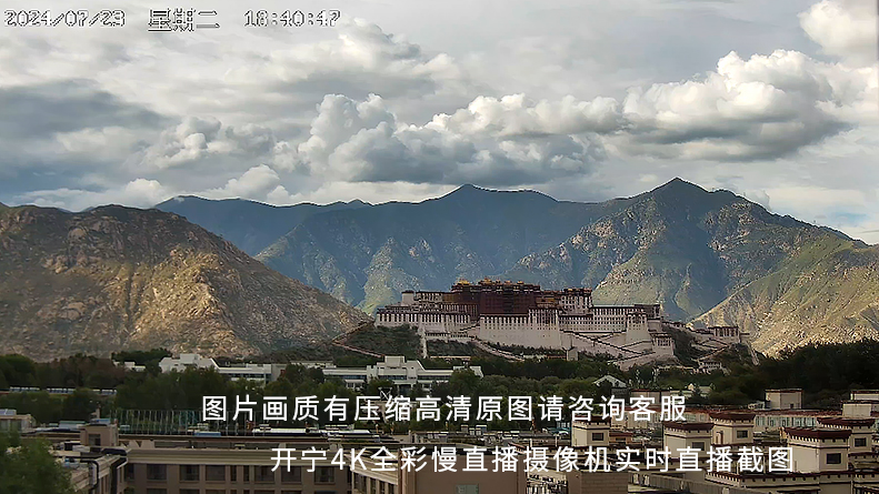 开宁4K全彩高清慢直播智能球机的应用,为这一需求提供了完美解决方案。慢直播设备搭载的4K超高清成像技术,能精准捕捉布达拉宫的建筑细节——红宫的鎏金顶在阳光下的光泽、白宫墙体的层次肌理、经幡飘动的弧度,都被清晰定格,让镜头前的观者仿佛置身酒店观景台。