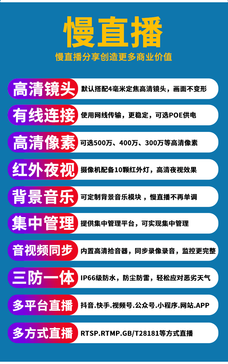 - 1、300万/500万/800万红外无畸变慢直播车载摄像机,一个摄像机就是一套慢直播系统;